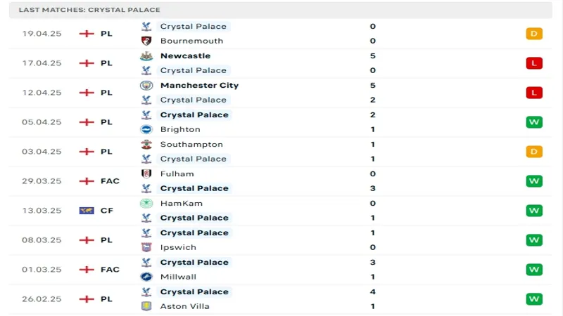 Crystal Palace, ngược lại, đang gặp khó khăn với phong độ không ổn định. Trong 5 trận gần nhất, họ có 2 chiến thắng, 1 hòa và 2 thua, trong đó có thất bại nặng nề trước Man City và Newcastle. Hiện tại, Crystal Palace đứng ở vị trí thứ 12 với 44 điểm sau 33 vòng đấu. Họ đã chắc chắn trụ hạng nhưng phong độ sân khách của họ khá yếu với chỉ 6 chiến thắng trong 16 trận.