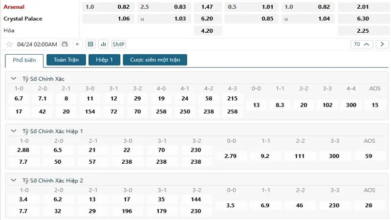 Bảng tỷ lệ kèo bóng đá trận đấu Arsenal vs Crystal Palace