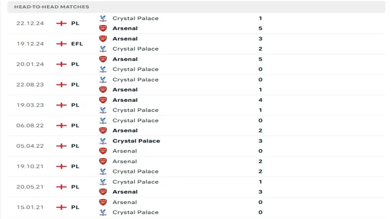 Lịch sử đối đầu của Arsenal vs Crystal Palace
