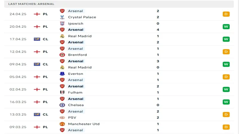 Arsenal đang có phong độ khá tốt, với các chiến thắng ấn tượng trước Real Madrid và Crystal Palace. Tuy nhiên, họ cũng có những trận hòa và đang duy trì một phong độ ổn định tại Premier League và Champions League.
