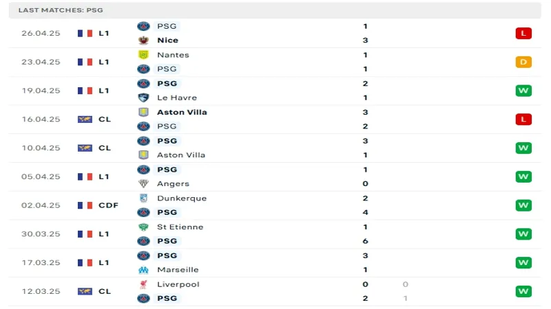 Paris Saint Germain, dù có một số trận thua, vẫn duy trì phong độ mạnh mẽ tại Ligue 1 và Champions League. Họ có chiến thắng thuyết phục trước Le Havre và Angers, nhưng cũng bị đánh bại bởi Nice gần đây.