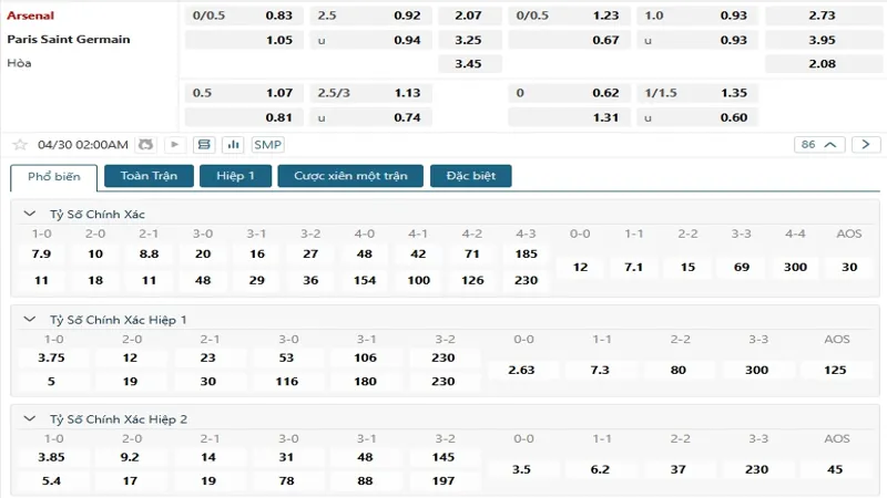 Bảng tỷ lệ kèo bóng đá trận đấu Arsenal vs Paris Saint Germain