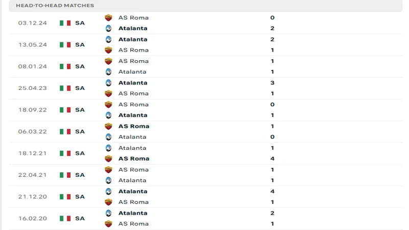 Trong 5 lần Atalanta vs Roma gặp nhau gần nhất, Atalanta chiếm ưu thế rõ rệt với 4 chiến thắng và 1 trận hòa. Cụ thể, Atalanta đã giành chiến thắng 2-0 trước Roma trong trận đấu gần nhất vào ngày 03/12/2024 và thắng 3-1 trong trận đấu trước đó vào tháng 04/2023.