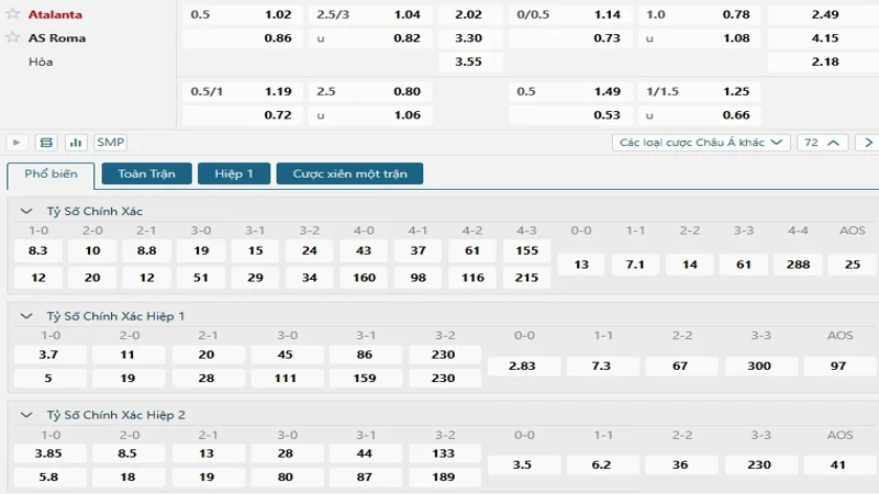 Bảng tỷ lệ kèo bóng đá trận đấu Atalanta vs Roma