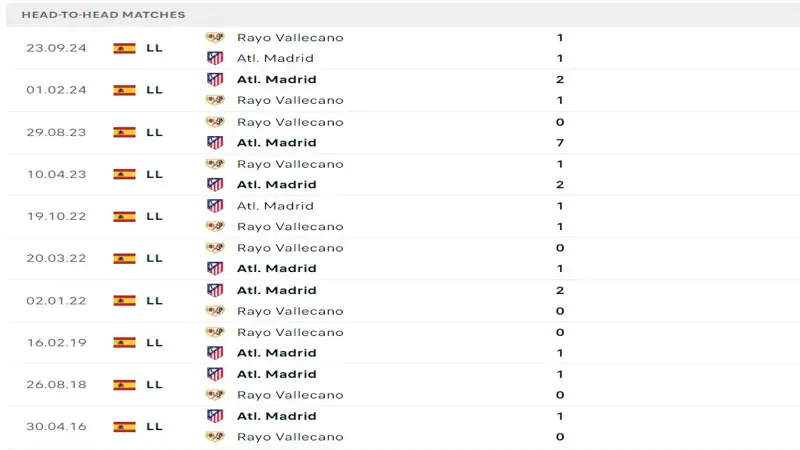 Lịch sử đối đầu của Atletico Madrid vs Rayo Vallecano