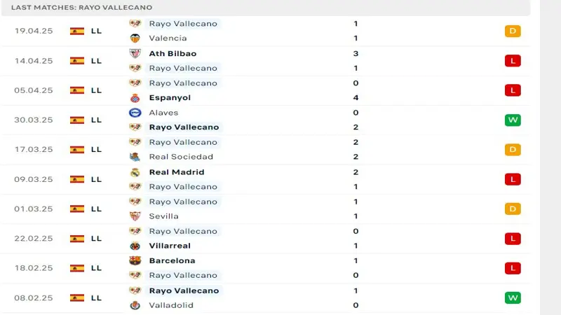 Trong khi đó, Rayo Vallecano không có thành tích ghi bàn ấn tượng như Atletico Madrid. Đội khách chỉ ghi được 35 bàn thắng và để thủng lưới 39 bàn trong 32 vòng đấu, với hàng thủ yếu kém. Thành tích ghi bàn của họ đã suy giảm đáng kể trong những vòng đấu cuối tại La Liga.