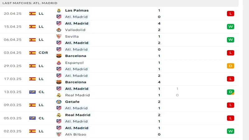 Phong độ gần đây Atletico Madrid vs Rayo Vallecano