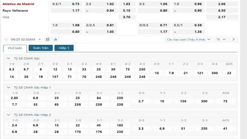 Bảng tỷ lệ kèo bóng đá trận đấu Atletico Madrid vs Rayo Vallecano