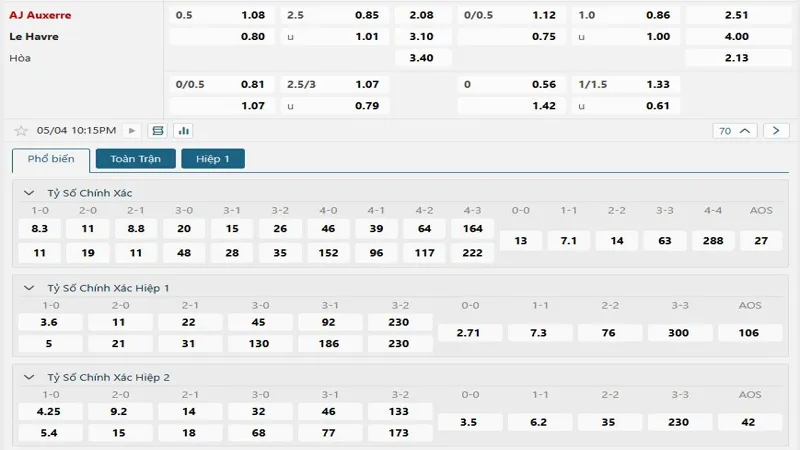 Bảng tỷ lệ kèo bóng đá trận đấu Auxerre vs Le Havre