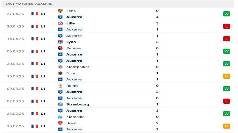 Thống kê 5 trận gần nhất cũng cho thấy hiệu suất ghi bàn của đội bóng này không quá nổi bật, khi họ chỉ ghi được 8 bàn – trung bình chưa tới 2 bàn mỗi trận. Đây là một tín hiệu cho thấy dù phong độ có dấu hiệu cải thiện, nhưng hàng công của Auxerre vẫn chưa thực sự đạt đến sự ổn định cần thiết.