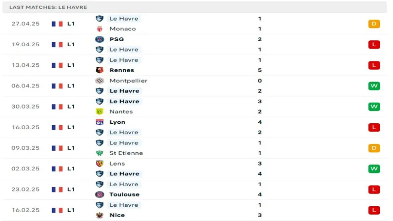 Phong độ sa sút khiến Le Havre rơi xuống nhóm cầm đèn đỏ. Sau 31 vòng đấu, họ chỉ có được 8 chiến thắng, 4 trận hòa và để thua tới 19 trận – một con số cực kỳ đáng báo động. Với chỉ 28 điểm trong tay, Le Havre hiện đang đứng thứ 16 trên bảng xếp hạng và kém vị trí an toàn 2 điểm. Điều này đồng nghĩa với việc nếu tiếp tục mất điểm, họ hoàn toàn có thể phải nói lời chia tay Ligue 1 vào cuối mùa.