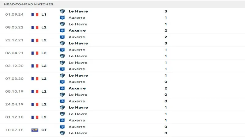 Lịch sử đối đầu của Auxerre vs Le Havre