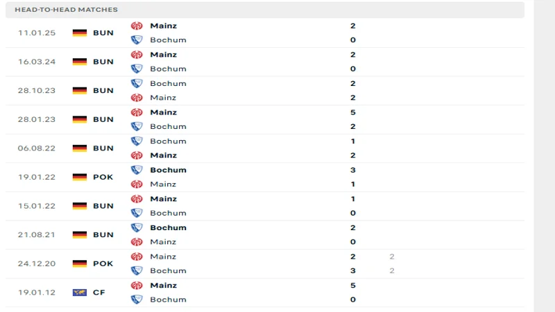 Mainz đang chiếm ưu thế rõ rệt trong các cuộc đối đầu với Bochum khi bất bại 10 trận gần nhất, trong đó có 7 chiến thắng. Đặc biệt, 4 lần gần nhất chạm trán, Mainz toàn thắng và không để thủng lưới. Xét về phong độ hiện tại, Mainz thi đấu không quá nổi bật nhưng ổn định hơn Bochum khi có 3 chiến thắng, 4 hòa và 3 thất bại trong 10 trận gần nhất.