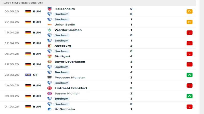 Phong độ gần đây Bochum vs Mainz