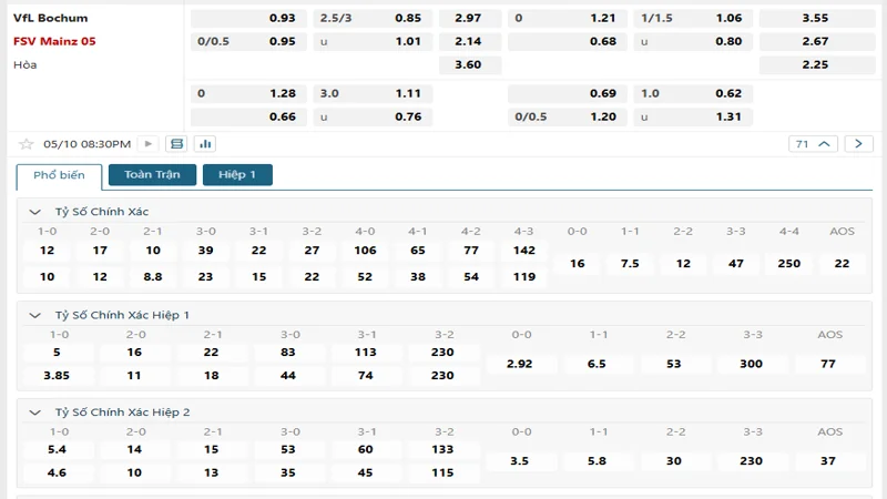 Bảng tỷ lệ kèo bóng đá trận đấu Bochum vs Mainz