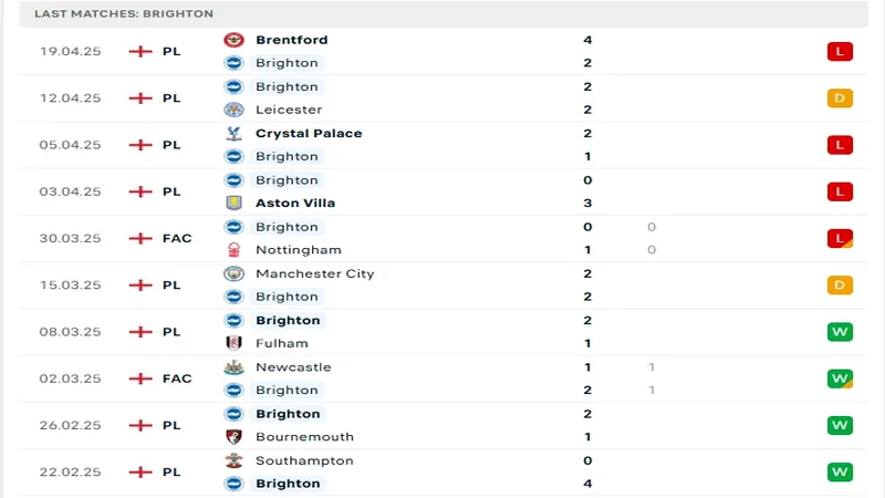 Dựa trên các thông tin, dưới đây là thống kê kết quả thi đấu và thành tích đối đầu giữa Brighton vs West Ham United: