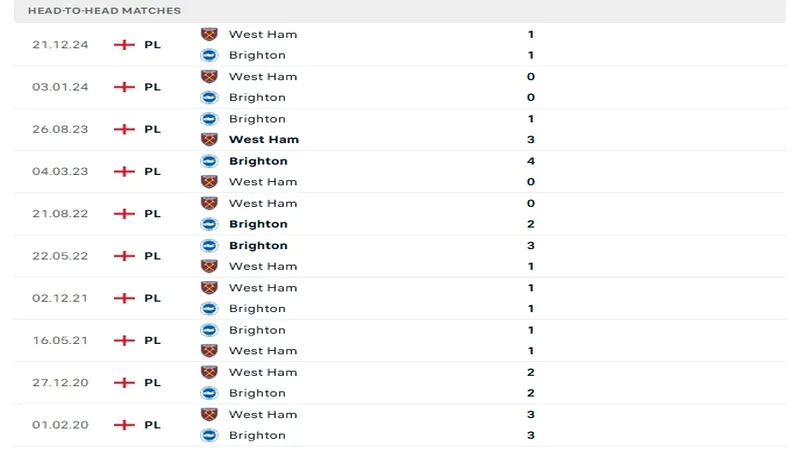- Brighton thường có thành tích đối đầu tốt khi gặp West Ham, đặc biệt là trong các cuộc đối đầu gần đây.