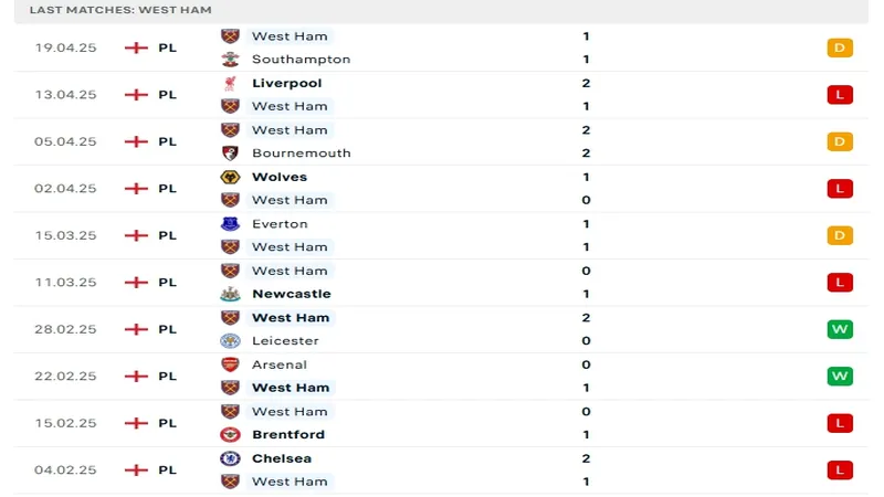 - West Ham United cũng đang gặp khó khăn với phong độ không ổn định, đặc biệt là trong các trận đấu gần đây. Họ đã phải nhận 4 thất bại trong 6 trận gần nhất, với trận hòa 1-1 trước Southampton là điểm sáng hiếm hoi.