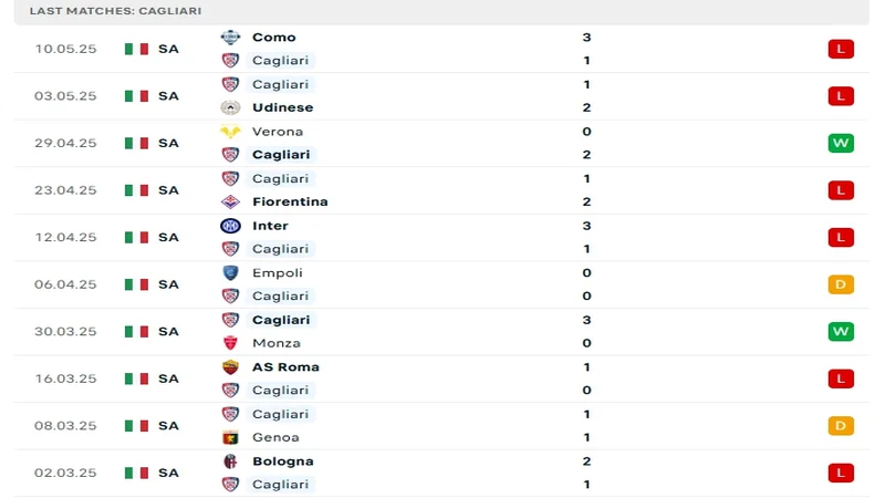 Cagliari hiện tại không có phong độ tốt, khi trong trận đấu gần nhất, họ để thua 1-3 trước Como, đây là thất bại thứ 4 trong 5 trận đấu gần đây của đội bóng này. Phong độ kém cỏi này khiến Cagliari rơi xuống vị trí thứ 14 trên bảng xếp hạng Serie A sau 36 lượt trận, với 8 chiến thắng, 9 hòa và 19 thất bại, đạt được 33 điểm.