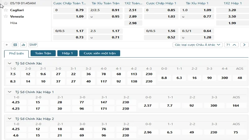 Bảng tỷ lệ kèo bóng đá trận đấu Cagliari vs Venezia