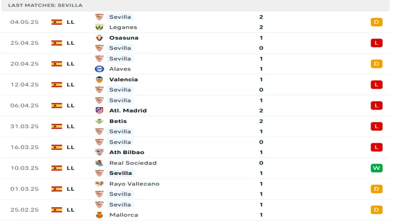 Dù vậy, Sevilla vẫn giữ lối chơi chắc chắn và thiên về kiểm soát bóng. Điều đó phần nào lý giải tại sao họ không thường xuyên ghi được nhiều bàn. Ở 3 trong 5 trận gần nhất, chỉ có tối đa 2 bàn thắng được ghi – phản ánh rõ sự thực dụng trong cách vận hành lối chơi. Tuy nhiên, trong bối cảnh hiện tại, hàng thủ không còn là điểm tựa chắc chắn như trước khiến họ thường xuyên mất điểm, kể cả khi đối đầu với các đối thủ bị đánh giá thấp hơn.