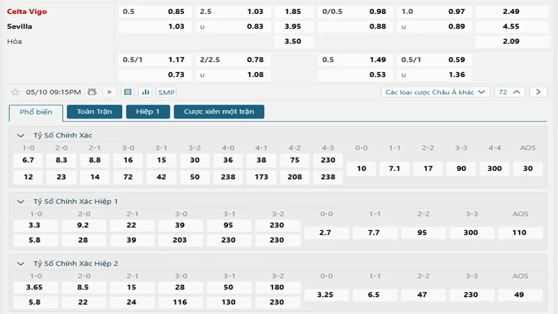 Bảng tỷ lệ kèo bóng đá trận đấu Celta Vigo vs Sevilla