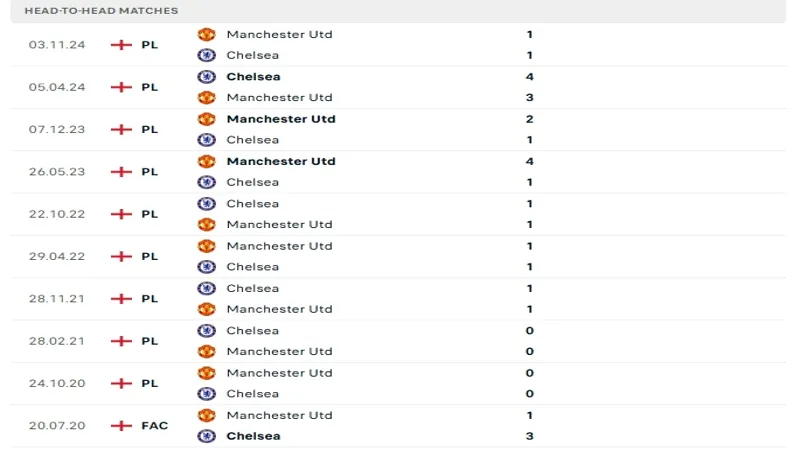 Chelsea vs Manchester United đã chạm trán nhau 11 lần gần nhất trên mọi đấu trường, trong đó mỗi đội có 3 chiến thắng và 5 trận hòa. Gần đây nhất, Chelsea thắng 4-3 trên sân nhà vào ngày 05/04/2024, còn lượt đi hai đội hòa nhau 1-1 tại Old Trafford.