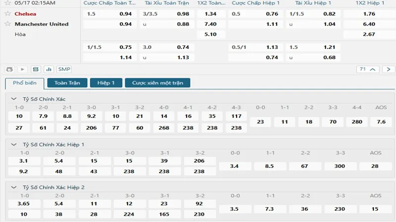 Ở kèo châu Âu, nhà cái Vua 88 cũng thể hiện rõ sự chênh lệch khi đưa ra tỷ lệ thắng cho Chelsea ở mức rất thấp – chỉ khoảng 1.45, trong khi tỷ lệ cho Manchester United lên đến hơn 6.00. Đây là con số phản ánh đúng thực lực hiện tại của hai đội cũng như xu hướng đầu tư của giới chuyên môn Vua88 và người chơi.
