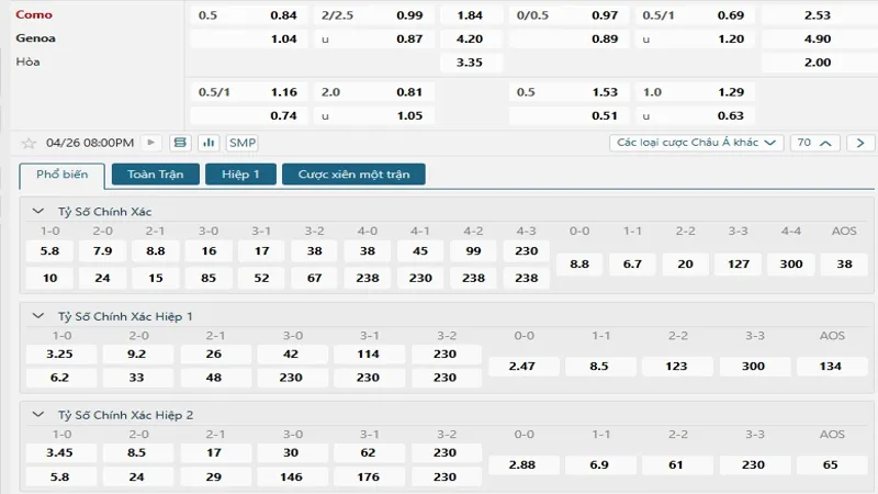 Bảng tỷ lệ kèo bóng đá trận đấu Como vs Genoa