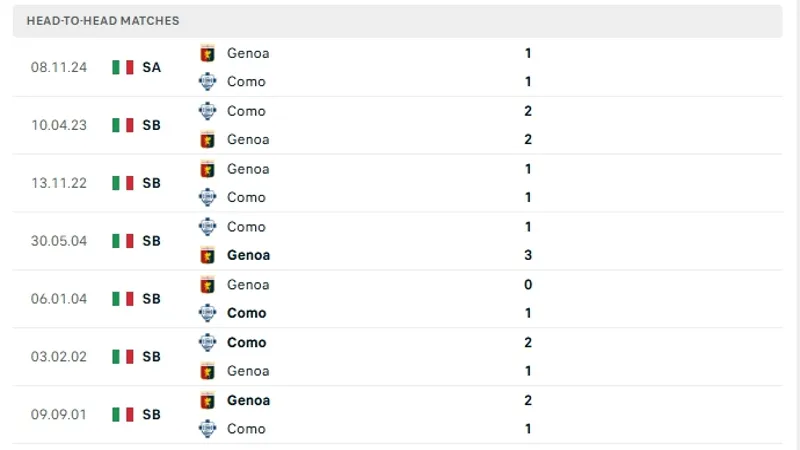 Trong 6 lần gặp nhau gần nhất, Como vs Genoa đều có thành tích khá cân bằng. Cả hai đội đều ghi được các chiến thắng và hòa nhau trong một số trận đấu. Cụ thể, Genoa giành chiến thắng 2 lần, còn Como thắng 2 lần và hai đội hòa 2 trận. Trong những cuộc đối đầu này, theo Vua 88 cả hai đều có những trận đấu cạnh tranh quyết liệt và không có đội nào hoàn toàn vượt trội.