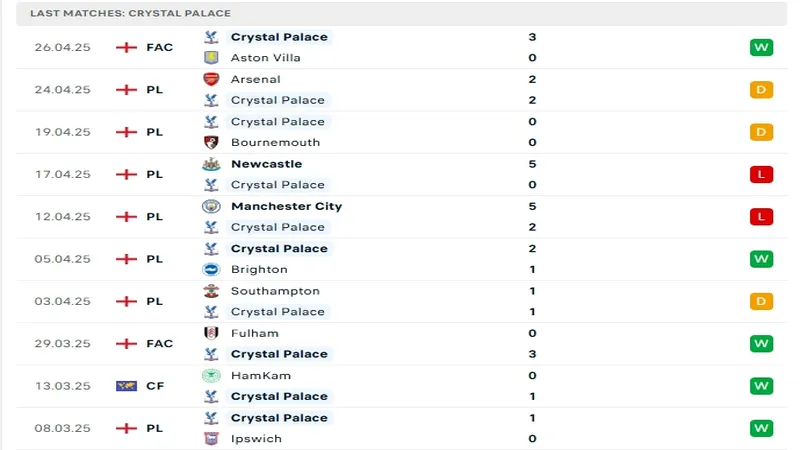 Crystal Palace đang có phong độ khá ấn tượng. Ở đấu trường FA Cup, họ vừa có chiến thắng đầy thuyết phục 3-0 trước Aston Villa, qua đó tiến vào trận chung kết một cách ấn tượng. Đây là chiến thắng không chỉ giúp tinh thần đội bóng lên cao, mà còn khẳng định sự ổn định của họ dưới thời HLV hiện tại.