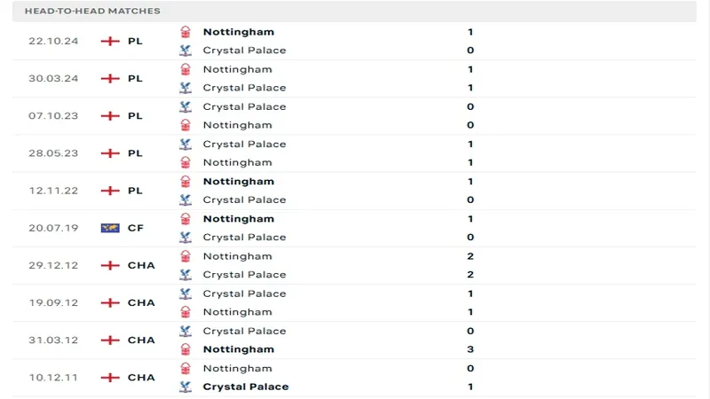 Trong 10 lần gặp nhau gần nhất, hai đội Crystal Palace vs Nottingham Forest tỏ ra khá ngang ngửa khi có đến 5 trận kết thúc với tỷ số hòa, trong đó phần lớn là những trận có ít bàn thắng (8/10 trận gần nhất có tối đa 2 bàn). Crystal Palace chỉ thắng 2 trận, còn Nottingham Forest thắng 3 trận, thể hiện sự cân bằng rõ rệt trong quá khứ.