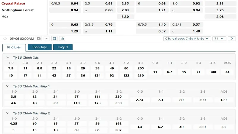 Bảng tỷ lệ kèo bóng đá trận đấu Crystal Palace vs Nottingham Forest