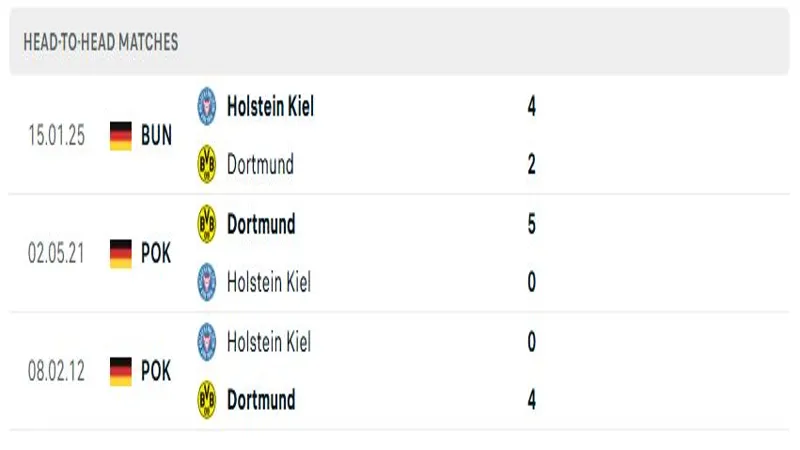 Trong cả 3 lần đối đầu gần nhất giữa Dortmund vs Holstein Kiel, đội bóng vùng Ruhr đều giành chiến thắng với cách biệt lớn và không để thủng lưới bất kỳ bàn nào. Trận đấu gần nhất diễn ra tại Signal Iduna Park, Dortmund đã nã tới 5 bàn vào lưới đối thủ mà không gặp quá nhiều khó khăn. Điều này phần nào cho thấy mỗi khi gặp các đội bóng yếu như Holstein Kiel, Dortmund luôn thể hiện được sự vượt trội về mọi mặt và không ngần ngại dồn ép để tạo ra tỷ số đậm.