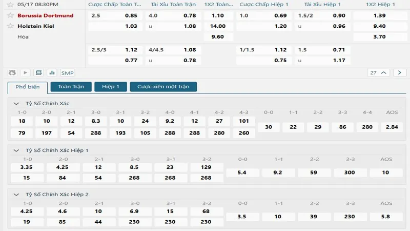 Bảng tỷ lệ kèo bóng đá trận đấu Dortmund vs Holstein Kiel