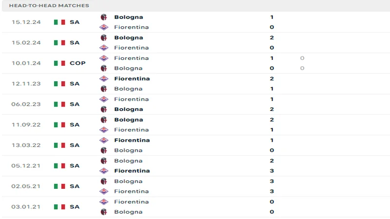 Lịch sử đối đầu của Fiorentina vs Bologna