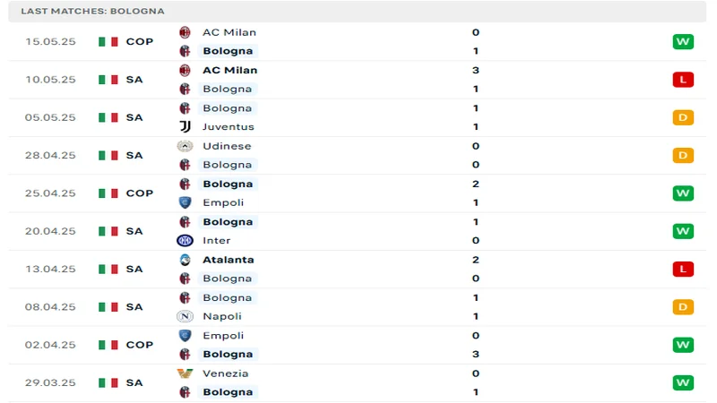 Trái ngược với Fiorentina, Bologna lại có phong độ tốt hơn rất nhiều trong những trận đấu gần đây. Họ vừa giành chiến thắng ấn tượng 1-0 trước AC Milan trong trận chung kết Copa Italia, qua đó lần đầu tiên trong 51 năm qua giành được danh hiệu này. Thành tích ấn tượng này không chỉ giúp Bologna có được chiếc cúp đầu tiên trong lịch sử mà còn giúp họ có thêm động lực lớn trong cuộc đua giành một suất dự cúp châu Âu.
