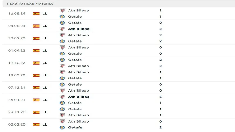 Ngoài ra, lịch sử đối đầu giữa hai đội cũng cho thấy Bilbao là đội thường xuyên chiếm ưu thế. Trong 5 lần chạm trán gần nhất, Bilbao có 2 chiến thắng và 3 trận hòa, chưa từng để thua Getafe – một con số cho thấy sự áp đảo về mặt tinh thần của đội khách.