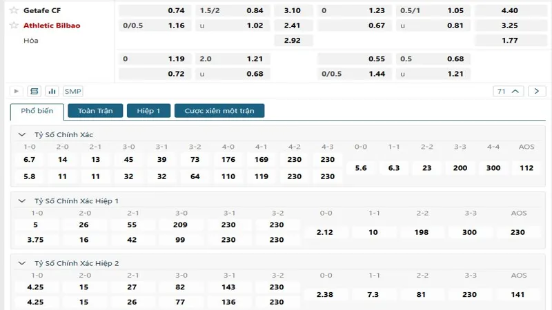 Tỷ lệ kèo châu Âu hiện tại đang nghiêng về phía đội khách, với mức 2.41 dành cho chiến thắng của Athletic Bilbao, trong khi mức ăn dành cho Getafe là 3.10. Đây là tỷ lệ cho thấy sự tin tưởng của nhà cái vào khả năng giành trọn 3 điểm của Bilbao dù phải thi đấu trên sân khách.