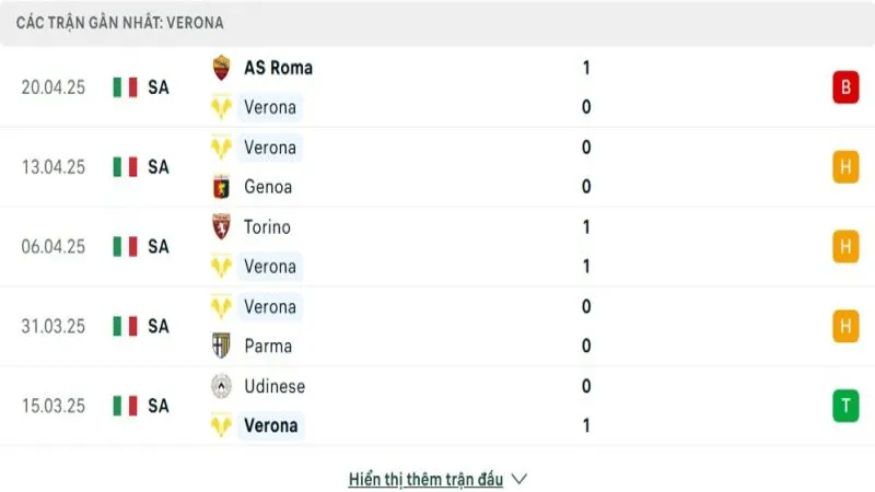 Thống kê phong độ gần đây Hellas Verona vs Cagliari