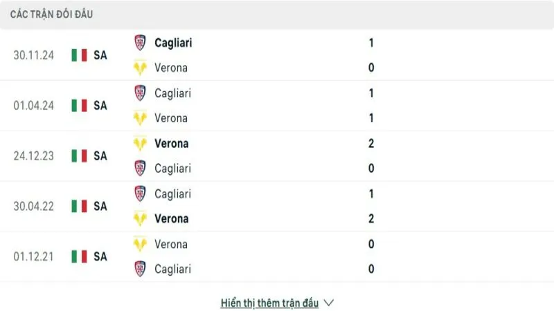 Thành tích đối đầu của Hellas Verona vs Cagliari