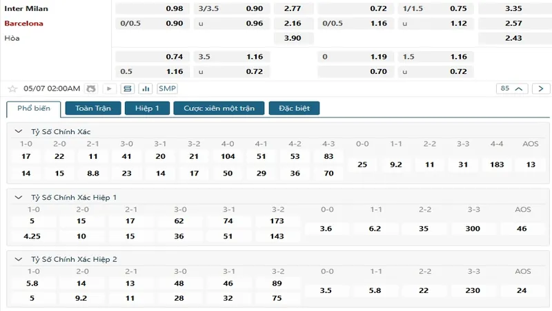 Bảng tỷ lệ kèo bóng đá trận đấu Inter Milan vs Barcelona