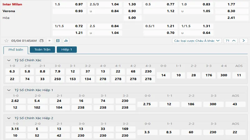 Bảng tỷ lệ kèo bóng đá trận đấu Inter Milan vs Verona