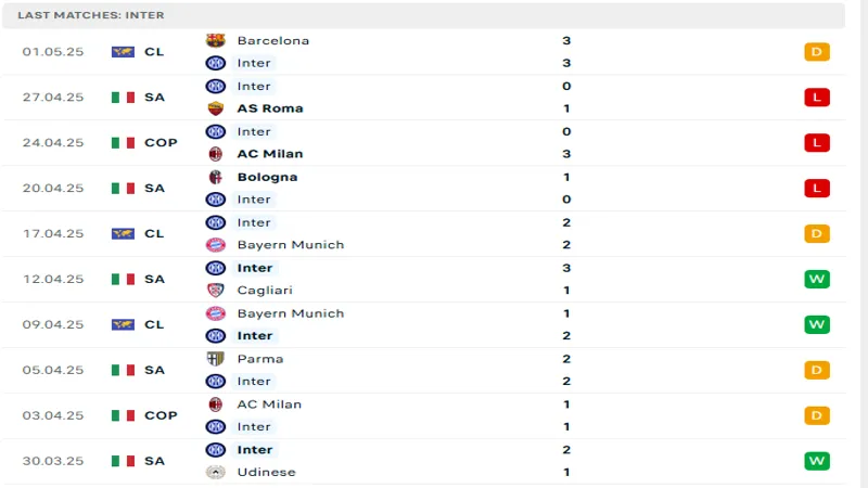 Ở vòng đấu gần nhất, Inter Milan đã có màn trình diễn ấn tượng khi cầm hòa 3-3 trước Barcelona tại đấu trường Champions League – một trong những đội bóng mạnh nhất châu Âu. Đây là trận bán kết lượt đi và kết quả đó mở ra cơ hội để Inter góp mặt tại trận chung kết nếu tận dụng tốt lượt về. Tuy nhiên, ở sân chơi quốc nội, phong độ của Inter lại không quá ổn định khi 5 vòng đấu gần nhất họ không có nổi một chiến thắng nào.