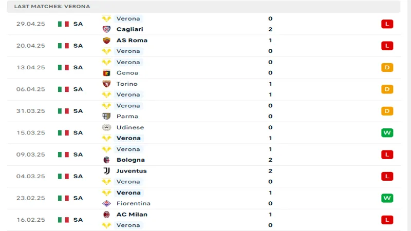 Đáng chú ý hơn, trong 6 trận gần đây, Verona chỉ ghi được đúng 2 bàn thắng – hiệu suất ghi bàn quá thấp và phản ánh rõ sự thiếu hiệu quả trong khâu tấn công của họ. Chính sự yếu kém này khiến Verona thường xuyên rơi vào thế bị động và dễ dàng đánh mất thế trận trước các đối thủ mạnh như Inter.