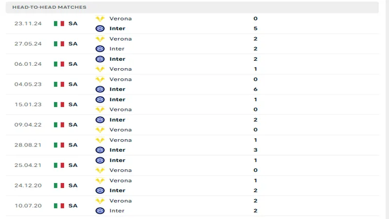 Lịch sử đối đầu cũng cho thấy sự áp đảo của Inter Milan. Trong 5 lần chạm trán gần nhất giữa hai đội, Inter giành 4 chiến thắng và chỉ 1 lần bị cầm hòa, không để thua bất kỳ trận nào. Điều đó chứng minh rằng Verona thường xuyên là “con mồi” ưa thích của đội bóng áo sọc xanh đen trong những mùa giải gần đây.