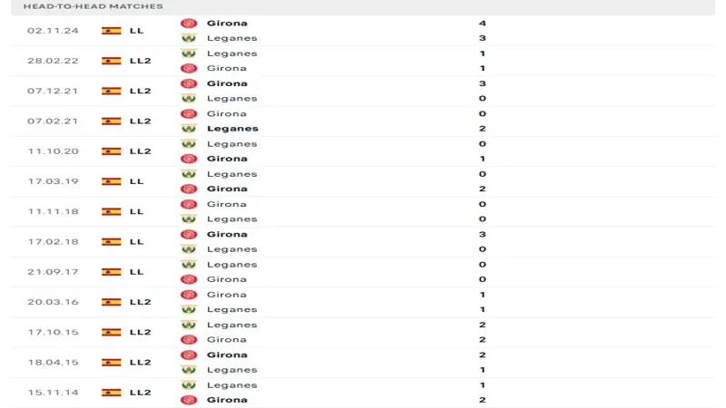 Các cuộc đối đầu giữa Leganes vs Girona trong lịch sử cho thấy một sự cạnh tranh khá cân bằng, tuy nhiên, với thành tích đối đầu gần đây, Girona có phần chiếm ưu thế. Cụ thể, trong 10 lần gặp nhau gần nhất, Girona đã thắng 6 trận, trong khi Leganes chỉ giành chiến thắng 2 lần. Lần gặp nhau gần đây nhất vào tháng 1 năm 2024, Girona giành chiến thắng 1-0 trên sân nhà của Leganes.
