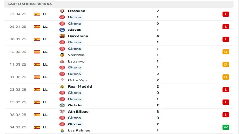 Girona cũng không có các kết quả thi đấu ổn định trong mùa giải này. Sau 31 lượt trận, họ có 9 chiến thắng, 7 hòa và 15 thất bại, với 34 điểm, đứng thứ 16 trên bảng xếp hạng, chỉ hơn nhóm xuống hạng 3 điểm. Mặc dù Girona có một vài trận đấu ấn tượng, nhưng các kết quả thi đấu của họ trong những trận gần đây khá tệ. Họ đã có 9 trận không thắng, trong đó có 6 thất bại và 3 trận hòa.
