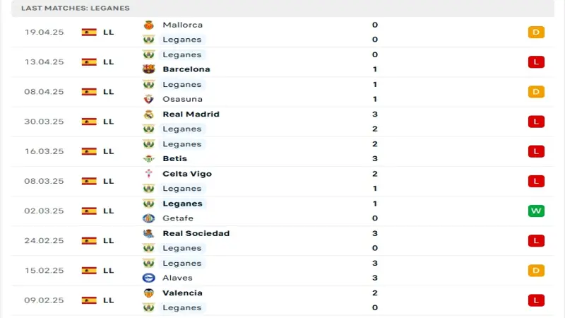 Mặc dù vậy, trong 5 trận gần nhất, Leganes vẫn giữ được sự ổn định nhất định khi có 3 trận khép lại mà không có quá 2 bàn thắng được ghi, điều này cho thấy họ vẫn duy trì được lối chơi phòng ngự chặt chẽ, dù không thể ghi nhiều bàn thắng. Mặt khác, hệ thống phòng ngự của họ cũng không quá chắc chắn, khi để thua khá nhiều bàn trong suốt mùa giải này.