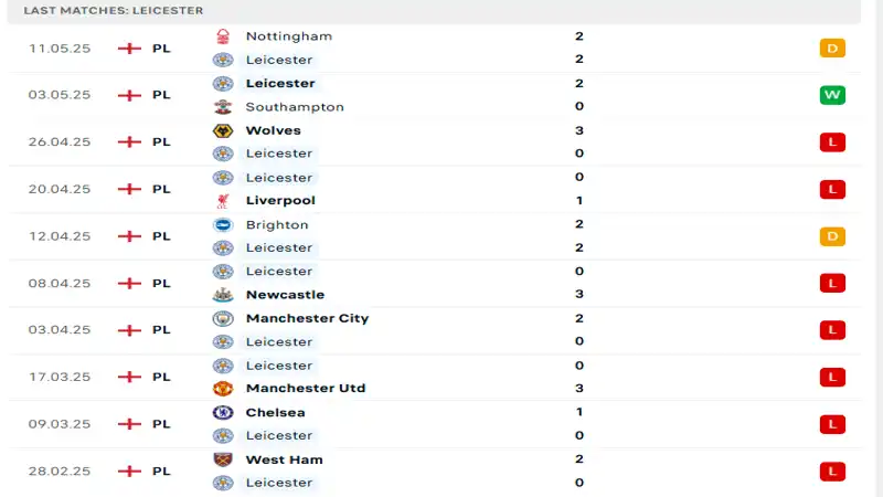 Trong trận đấu gần nhất, Leicester City đã có được một trận hòa 2-2 trước Nottingham Forest, đây là trận hòa thứ hai liên tiếp của họ sau một chiến thắng trước đó. Mặc dù Leicester City đã chính thức xuống hạng và những chiến thắng gần đây không còn mang nhiều ý nghĩa, đội bóng này vẫn rất muốn mang lại niềm vui cho người hâm mộ trong những trận đấu cuối mùa.